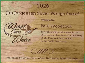 Paul was recently honored with the Jim Jorgenson Silver Wings Award “For outstanding achievement in the observation, education and stewardship of the birds and their habitat in the Pacific Northwest”. The award was presented by Wings Over Water Northwest on March 13, 2026.